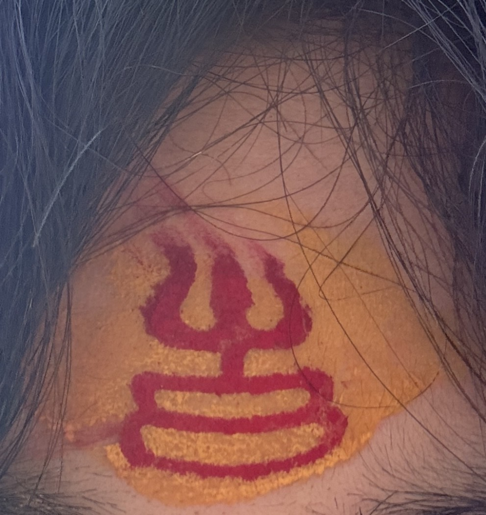 話が逸れますが、私はインドバラナシのガンジス川のほとりを歩いていた時、修行僧のような人に勝手に額に槍模様の顔料を塗りつけられました。ヒンドゥー教のシヴァ神を表すマークだそうで守護してくれるマークだと言われました。
