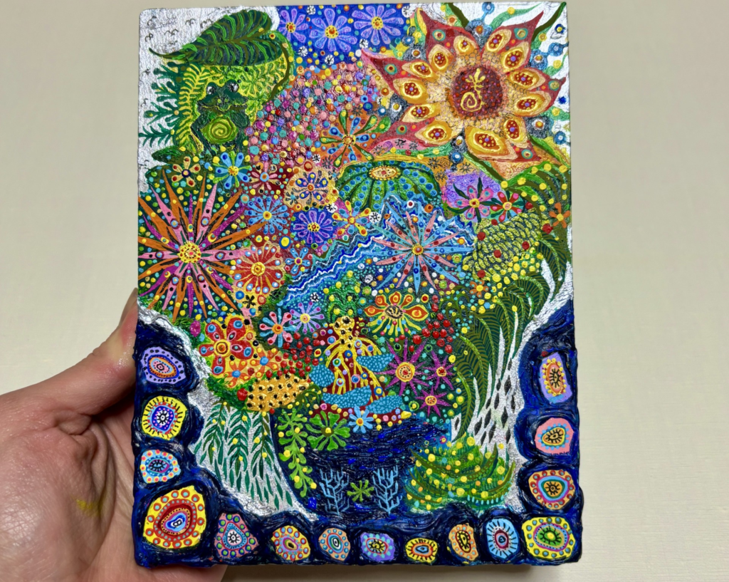 SSMサイズ(227㎜×227㎜)木製パネルにアクリル絵の具、ペン
