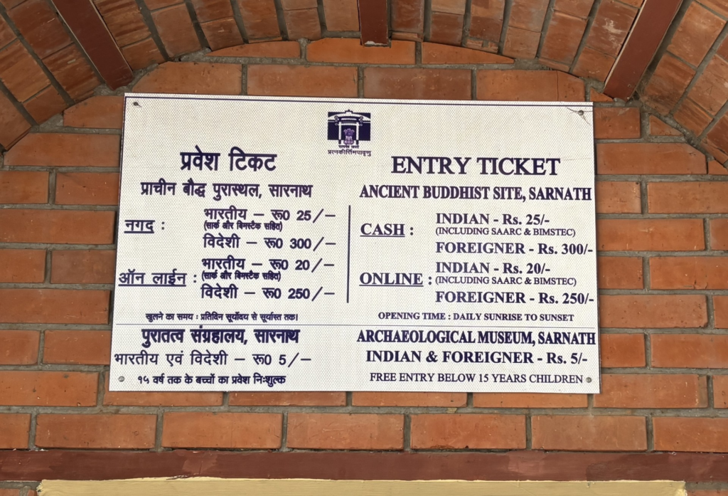 入場料は、サールナート遺跡の入場料が現金だと300ルピー(約540円)、オンラインだと250ルピーです。今回はすぐ側にあるサールナート博物館にも入場するので5ルピー(約9円)を合わせて305ルピーです。